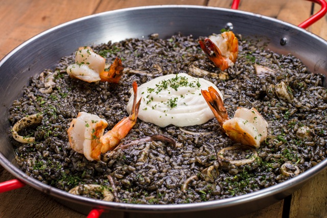 This scrumptious paella dish is Spanish rice cooked in a paella (pan) with squid ink and squids, and topped with garlic mayonnaise and tiger prawns.