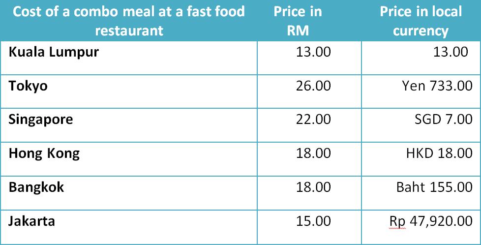 KL is also one of the cheaper destinations in the region, especially for accommodation and food, in comparison to its surrounding capital cities. To put this into perspective, here’s a quick look at the cost of a fast food meal in KL compared to other cities in nearby countries: