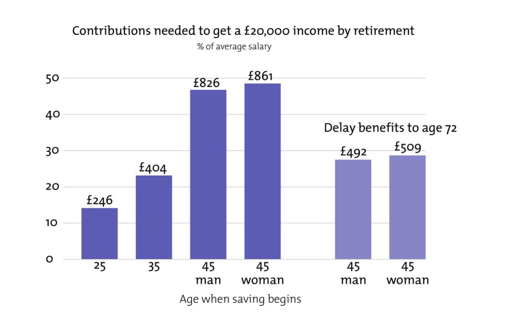 The table below shows just how much needs to be paid into a pension each month to obtain a £20,000 per year pension (in today’s monetary terms) from age 67.