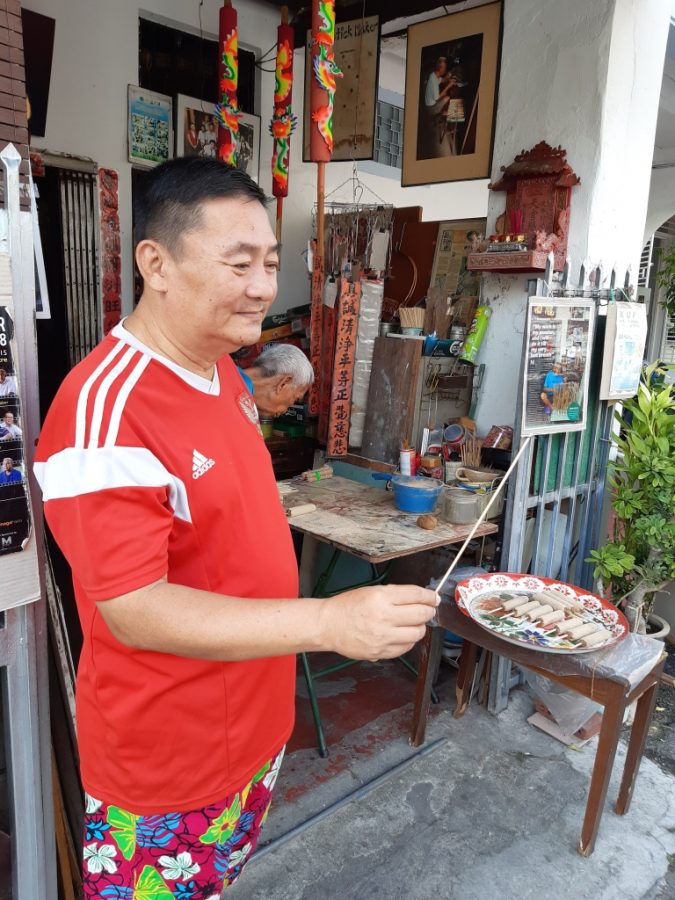 Turning into a quaint, narrow lane, I witnessed an elderly man moulding thick mixture onto thin bamboo sticks within an unassuming shophouse. If it weren’t for the newspaper cuttings of Mr Lee himself and an array of joss sticks, one might assume the building only operates as a simple home. Following a warm welcome from his son, Mr Chin Poh, who was drying joss sticks under the sun, I was introduced to the senior gentleman; his skills fluid and his smile sincere. He was preparing a fresh batch of sticks which were rather plump and short compared to the more common slender ones. Recognising my curiosity, his son explained, “These are being custom made for a tourist from Germany who wants the joss sticks to be identical to frankfurters.”