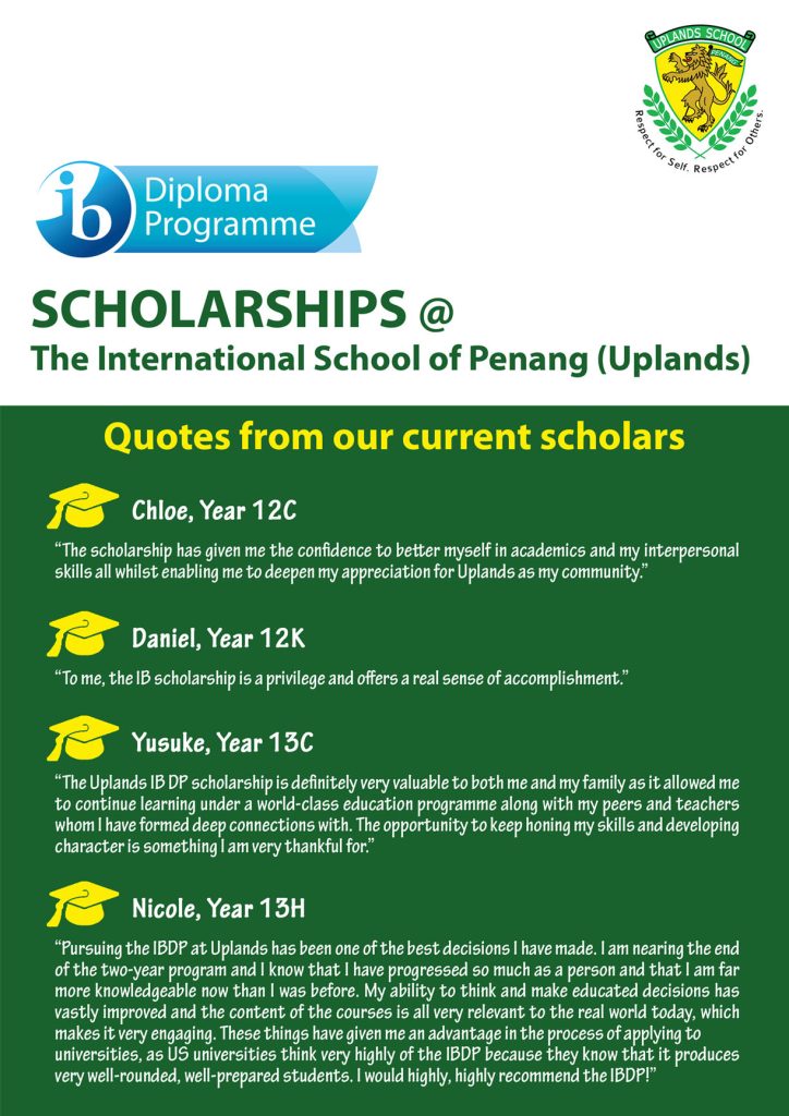 Do you want to be ready for the dynamic world of the future, poised for success in the global marketplace? The IB Diploma Programme Scholarship at Uplands will provide up to 5 students the opportunity to gain these key skills and ensure entrance to their universities of choice. Uplands is the only school in Penang offering this prestigious programme. Apply now for a scholarship for up to 100% of tuition from August 2020 to May 2022. Visit https://www.uplands.org/school/uplands/ib-scholarships-bursaries/ for more information.
