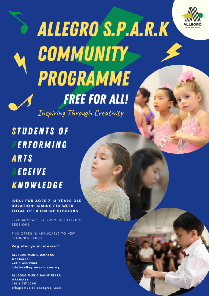 We recognise that it is particularly challenging for parents and children during this time and it is with the hopes that if your child needs a creative outlet, this programme is for you. Allegro offers taster sessions for piano/keyboard, ukulele/guitar, singing and dance, to instill a SPARK of inspiration to your week. This programme is FREE for a duration of 4 weeks, details below in the poster.