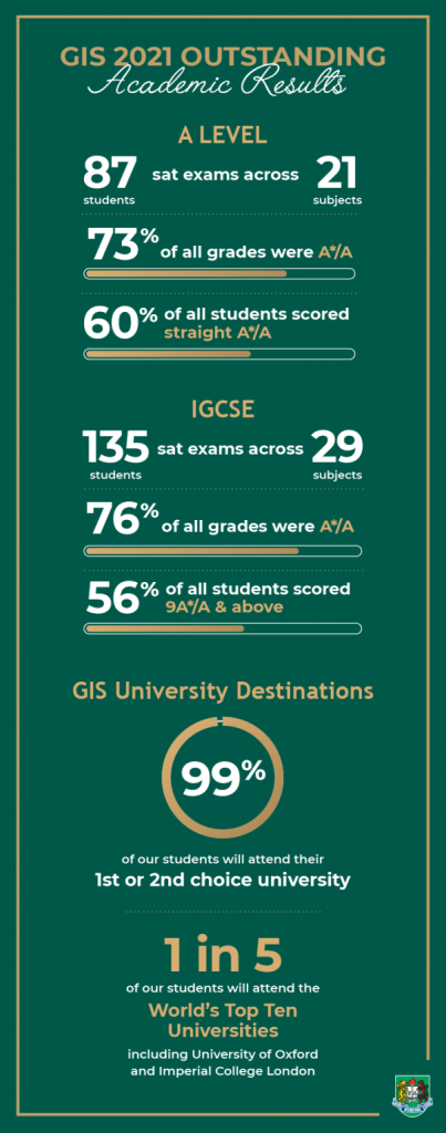 “We celebrate yet another highly successful year of exam results for students across our IGCSE, AS and A level courses —the percentage of top grades across the board is a phenomenal achievement! Whilst top grades are certainly a cause for celebration, our personalised learning and holistic approach to academic care, help to instil the core values of GIS. This year’s value added data shows exactly how successful this personalised approach is- with students significantly exceeding the expectations projected from standardised external baseline tests.” -‒ Amy Ward, GIS Head of Secondary