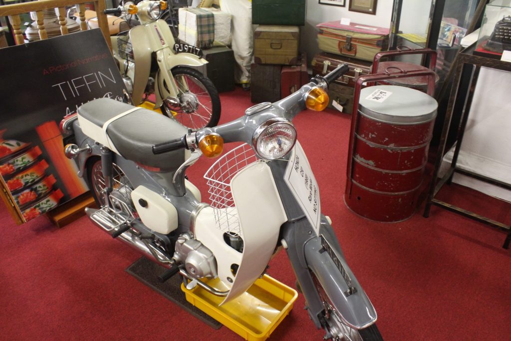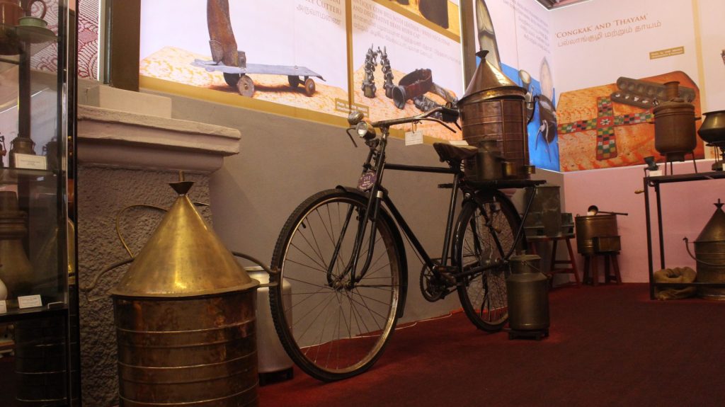 After walking back and forth through the museum, I recognised that tiffin carriers and trunks abound here. These bulky carriers are heavy on their own, and I wondered what if they were fully loaded? Intuitively acknowledging my curiosity, Mr Mahalingam added, “How about balancing them on bicycles?”