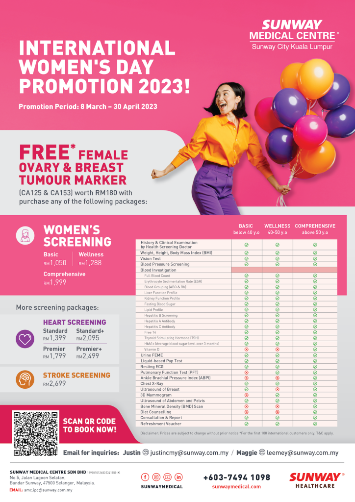 As we are celebrating International Women’s Day, we believe in empowering women to take control of their health and well-being. That’s why, at Sunway Medical Centre, we’re offering comprehensive health screening packages to help you stay healthy and risk-free. By taking care of yourself, you’re also taking care of the people you love. So, let us help you prioritize your health this International Women’s Day.