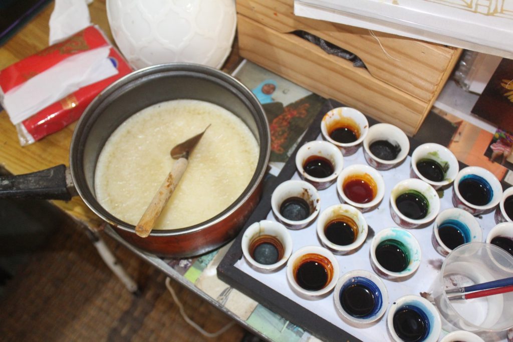It’s mesmerising: The canting, a pen-like copper tube filled with molten wax, meticulously runs over a sketch on a cloth. There is no sign of easels, state-of-art equipment, or reference photographs, but the wax still gradually shapes roses and leaves by delicate hand gestures. Peering over the textile, I was intrigued by Rozana’s precision as she kept filling up the cloth. This studio space is middling in size by most commercial standards but, as its constant customers suggest, one would consider it as a batik haven. Wax sprouts, brushes, palettes, and jars of liquid paints instantly evoke a sense of childhood. Along a street that brims with quick snacks and photo spots, this gem requires a modest investment of your time in order to appreciate this now very rare skill.
