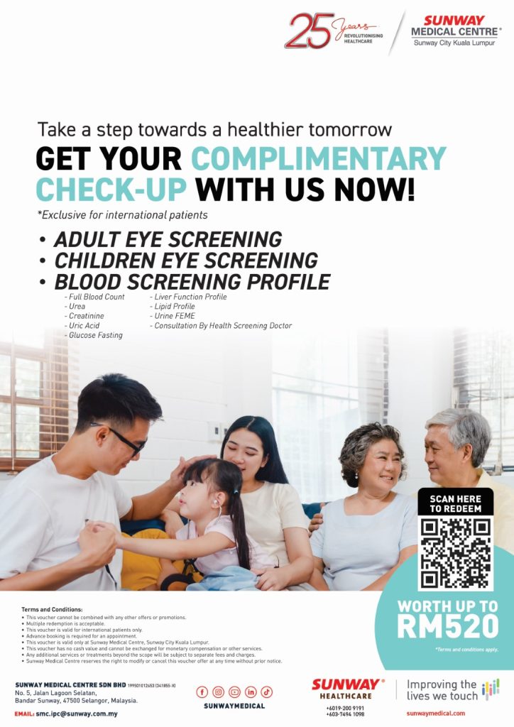 Are you an international resident seeking comprehensive health services in Malaysia? Sunway Medical Centre extends a warm welcome to you with an exclusive offer – a complimentary health check-up worth up to RM520! As part of our commitment to providing world-class healthcare, we understand the importance of preventive care, and this complimentary check-up is designed to ensure your well-being. This complimentary health check-up offers three types of screenings for our international patients: