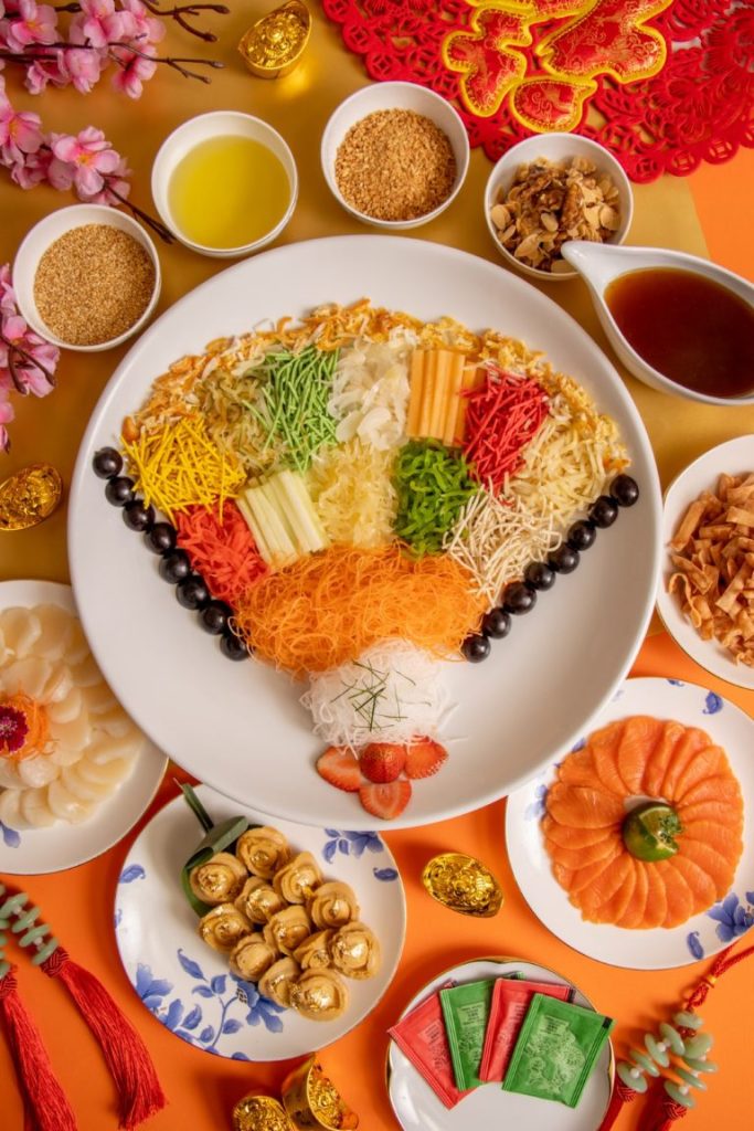 - Salmon Yee Sang with Hokkigai and Jellyfish Flower (RM155 half, RM308 full).