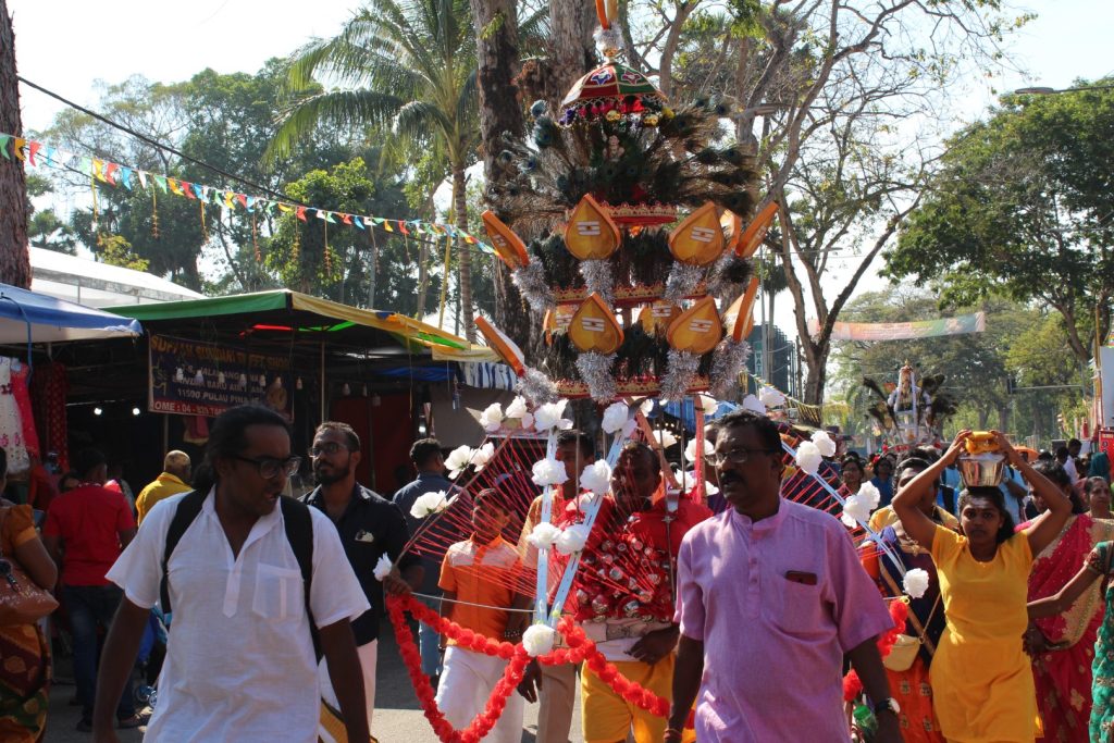 The most common ones are the Thol Kavadi and the Mayil Kavadi. The former, also known as Sakkarai Kavadi, is typically carried by the Chettiar Indians on the shoulder during Thaipusam eve. The semi-circular structure is made from wood, fastened on both sides with peacock feathers and holds a pot filled with Nattu Sakkarai (Indian organic sugar).