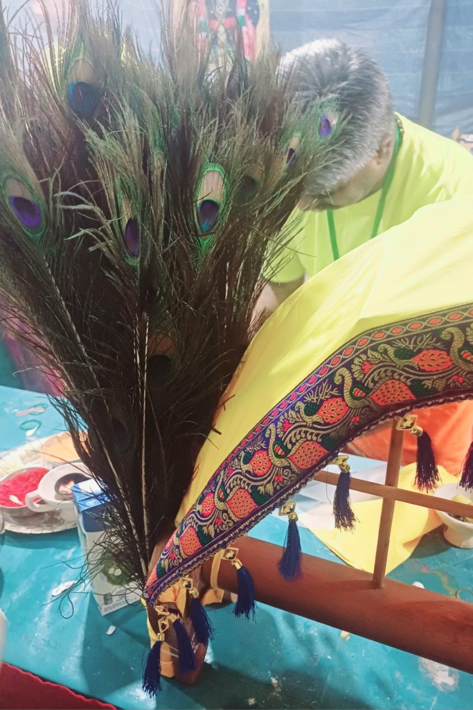 Conversely, putting together a Mayil Kavadi is no easy feat as it can reach up to 3 m in height and weigh up to 40 kg. Despite the nod to creativity, kavadi-makers still embrace traditional values when making these structures. These kavadis are often built in tiers with an abundance of peacock feathers, lights, and ornaments, and supported with a waistband and shoulder rests with spikes for the kavadi-bearer. Some devotees often get their cheeks, forehead, and torso pierced with spears as an added state of devotion.