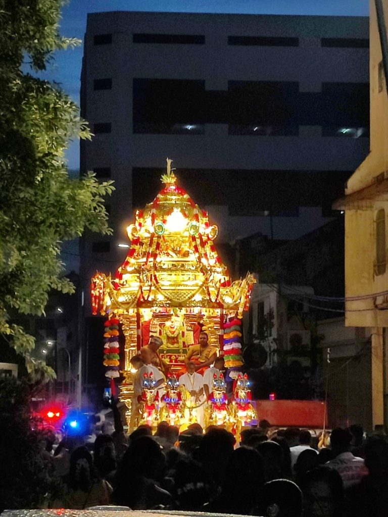 Both chariots start from different temples but follow the same route. The Golden Chariot departs from Sri Mahamariamman Temple—Penang’s oldest Hindu temple—while the Silver Chariot sets off from Kovil Veedu Temple. Beginning in Little India, the streets come alive with energy. The Sacred Walk, where thousands of devotees follow the chariots barefoot, takes more than half a day to reach Jalan Kebun Bunga. Along the way, the chariots stop to receive offerings, and children are lifted to receive blessings from the deities.
