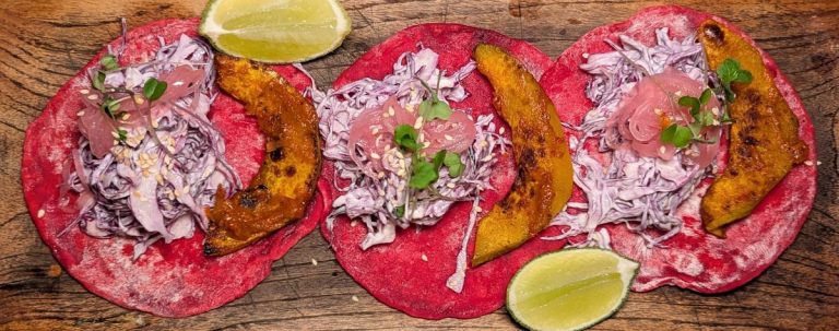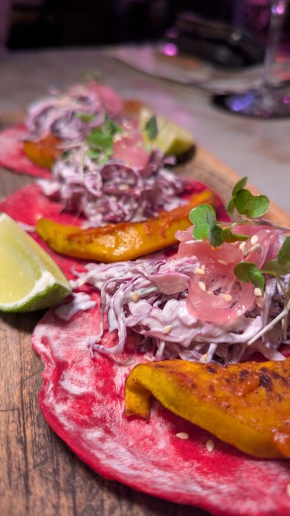 We chose a couple of intriguing options from the ‘Nibbles to Share’ section of the menu, including the Blushing Pumpkin Tortillas (RM25) and the Crispy Cheesy Flatbread (RM28). The tortillas, made ‘blushing’ by the addition of beetroot, were topped with glazed pumpkin, miso chili dressing, pickled onion, purple cabbage, and some microgreens. If you’ve ever had fresh fish tacos, these may remind you of that, just because of the various textures and the taco-like form factor. We really enjoyed these, and felt this menu item was both creative and tasty.