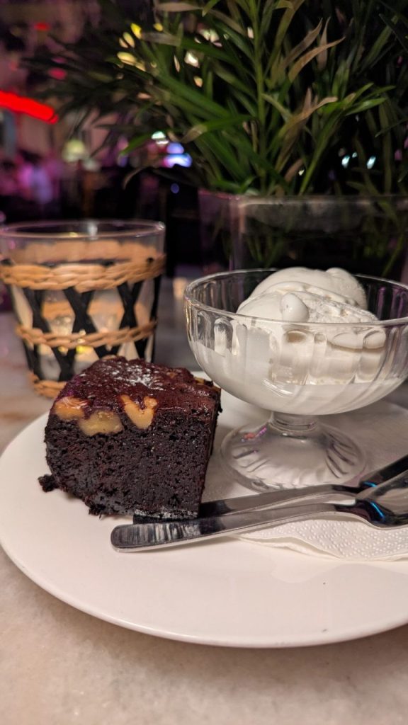 Desserts here mostly comprise a selection of cakes and pastries from a display case and we followed our server’s recommendation and ordered a decadent brownie with a scoop of vegan ice cream. The cakes are all baked at the restaurant’s sister vegan bakery just up the road called LaGula. While the ice cream has a soft serve-like texture, it was still a fine accompaniment to the rich, chocolatey brownie, and a nice ending to a most enjoyable meal.