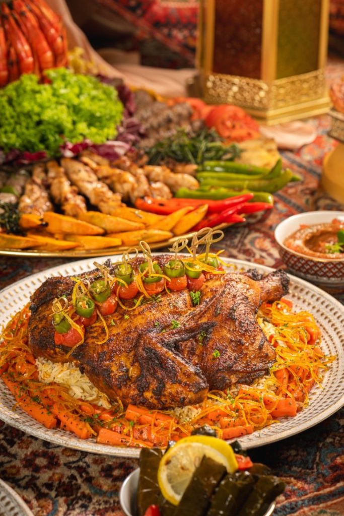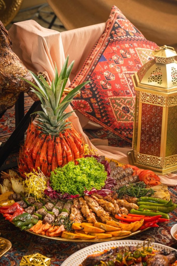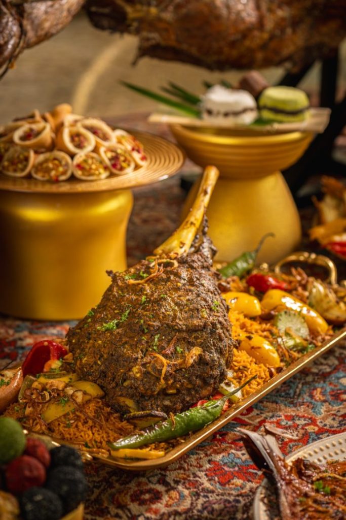 The star of the buffet is the Spit-Roasted Whole Lamb, perfectly seasoned and slow-cooked to tender perfection. Other highlights include Maqluba, a fragrant layered rice dish; Chicken Fatteh, a comforting Levantine classic; Havj Polo, an aromatic Persian carrot rice dish; and Mixed Grill, a selection of succulent meats grilled to smoky perfection. For those who love fresh, briny flavours, an impressive seafood bar awaits, featuring plump prawns, freshly shucked oysters, and marinated mussels.