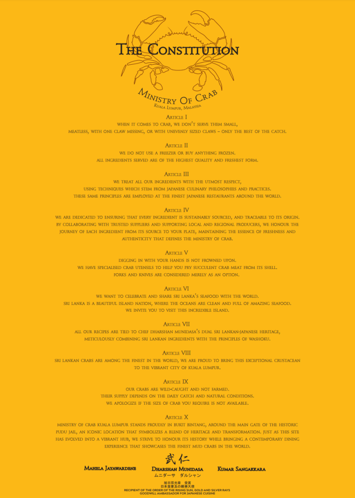 In true Ministry of Crab fashion, freshness is paramount. The restaurant operates on a “No Freezing, No Chilling, No Reheating” philosophy, ensuring that every dish is served at its peak. This dedication to quality is one of the many reasons why the brand has garnered such an esteemed reputation worldwide. A full Ministry constitution lays out the rules which govern the restaurant (see below), so guests can be assured of the highest quality, authenticity, and attention to detail.