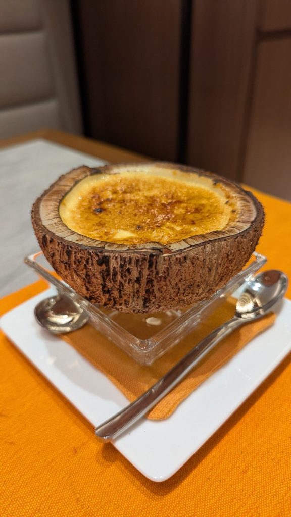 To end on a sweet note, the Coconut Crème Brûlée (RM38) puts a tropical twist on the classic French dessert, with coconut cream adding depth and creaminess to the silky custard. We found favour with the subtle notes of coconut present in the custard, and particularly like that the sugar was torched and caramelized at the table, adding not only a bit of drama, but ensuring a crisp, perfect sugar ‘crust’ on the beloved dessert.