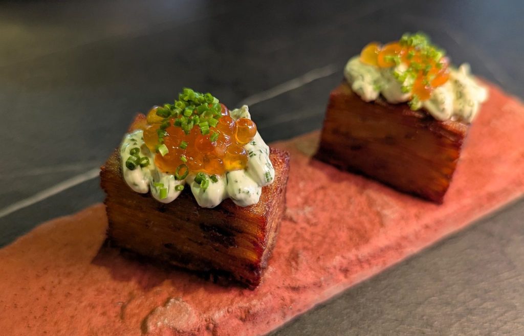 We started with a few light bites to whet the appetite. Pommes Anna with herbs, crema and smoked trout roe is the kitchen’s interpretation of a French classic of crisped layered potato accompanied by crisped potato layers complemented by nutty brown butter, herb-infused crema, and topped with smoked trout roe.