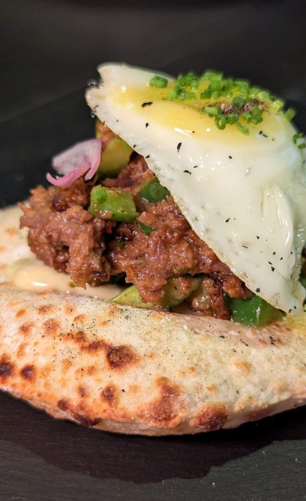 Next up, deboned chicken wings with pad kra pao and fermented hot sauce offered spiciness, along with a crispy texture from the caramelized chicken skin. We also placed an extra order from the regular menu for the Barbacoa Lamb Tacos (RM24). Very, very nice… and keep in mind, everything is cooked by fire, either in what amounts to a wood-fired broiler or a blazing-hot wood-fired oven.