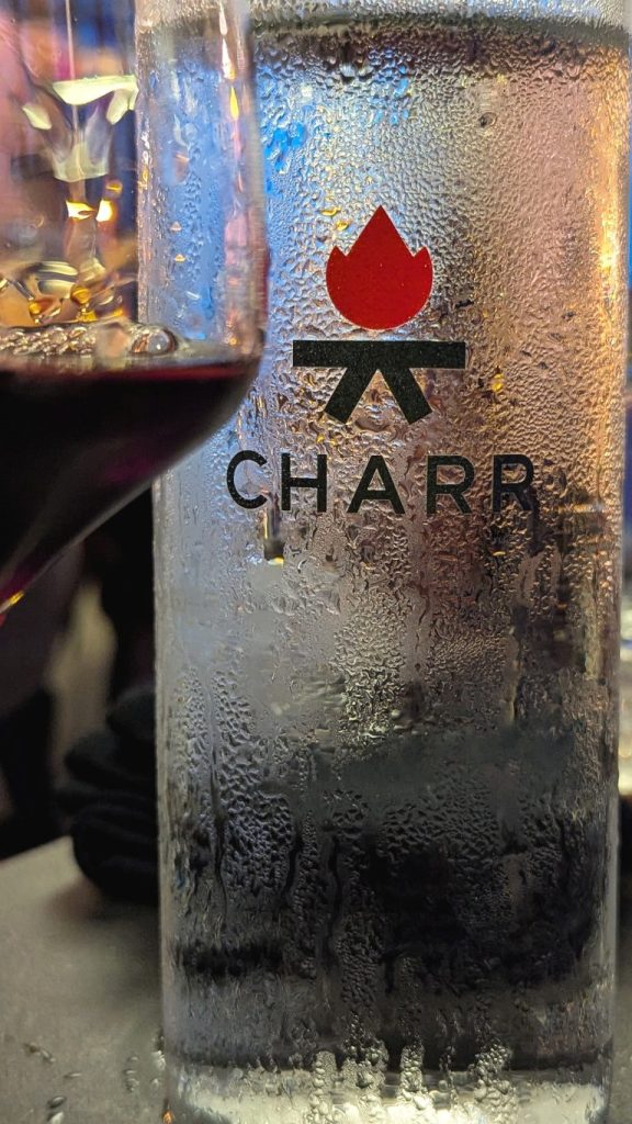 In our experience, the restaurants which have an open kitchen, in full view of diners, tend to turn out excellent food. Over the years, we’ve found virtually no notable exceptions to this little rule, so as we took our seats at CHARR, our gaze was surprisingly not trained on the stellar 47th-floor views of the city, but rather the fully open kitchen with its two woodburning cooking stations – both fully ablaze in anticipation of the dinner rush. Diners can choose a table inside, or outside in what we’d call a semi-al fresco dining space, in that it’s not fully open, but definitely leans towards more of an outdoor experience. The background music was filled with mostly contemporary hits (we’d say largely from the last couple of decades), and was never intrusive or overbearing.