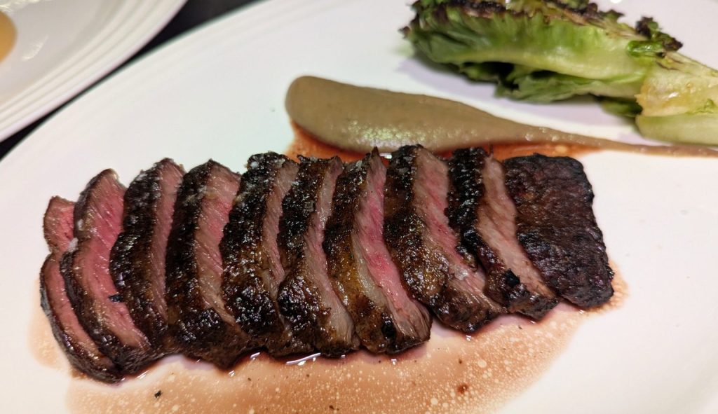 As we got to the mains, each of us was able to choose from four selections. We opted for the Sanchoku Wagyu MB7 with smoked shallots and beef jus, and a Smoked Duck Breast with rosemary apple. Though both were tasty, our clear favourite was the Aussie Wagyu. Our portion was admittedly slightly overcooked (a roaring open wood fire still presents challenges), but even though the beef was more medium than medium-rare, it was still delicious. The other options on the menu included a whole spring chicken and the ‘catch of the day’ for those who prefer seafood.