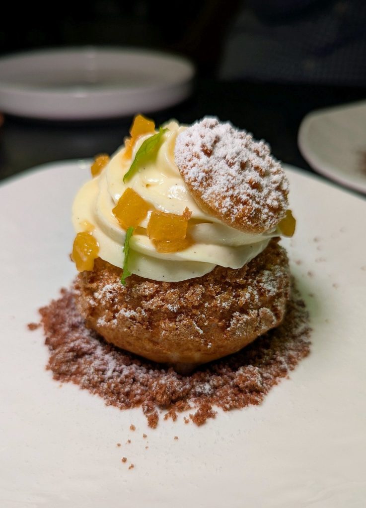 Dessert choices included a dark chocolate Lava Tart and a Choux Craquelin with pineapple. We ordered one each, and much like the mains, a clear winner quickly emerged. Chocolate lovers will of course exult in the rich tart (with its curious smoked vanilla ice cream, which was if nothing else a real conversation piece), but we gravitated towards the choux, that wondrous light French pastry delight, lashed with tropical flavours and a nice airy creme. It was a fine finish to a truly enjoyable and engaging fire-centred meal.