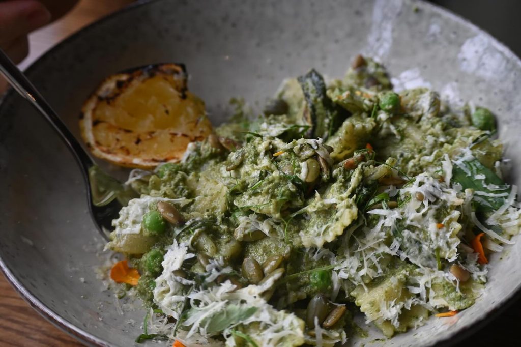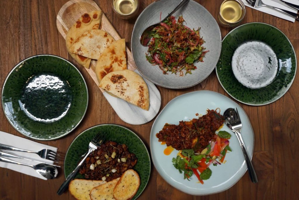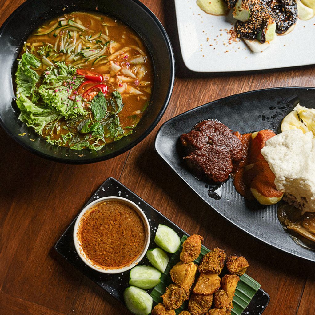 Combining a café and concept store, Kommune on Victoria Street offers a plant-based experience in a tranquil, sunlight-filled space. Appetizers include Cucur Labu (roasted pumpkin fritters) and Terung Bakar (woodfire-grilled eggplants). Mains like Chilled Mee Rebus and Zucchini Rendang highlight inventive Malaysian fusion. End on a sweet note with Lempeng, traditional coconut pancakes topped with fruit and coconut ice cream.