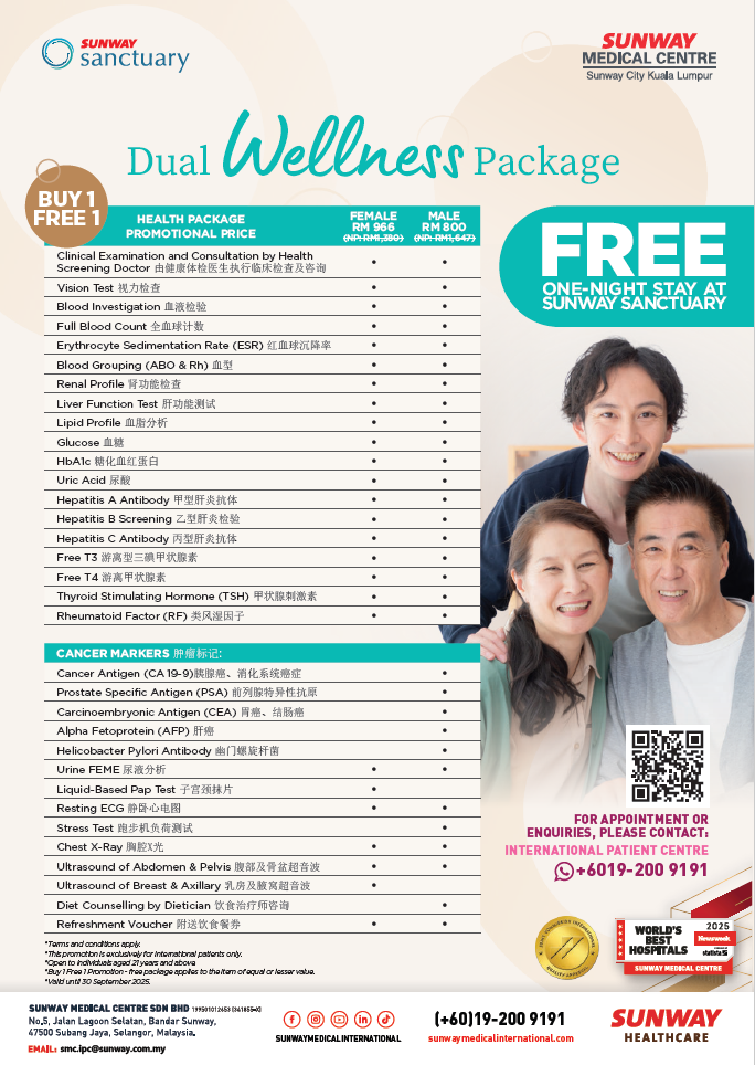 Enjoy a Buy 1 Free 1 Health Screening Package with a Complimentary One-Night Stay at Sunway Sanctuary — Exclusive for International Patients. Offer valid until September 30, 2025.