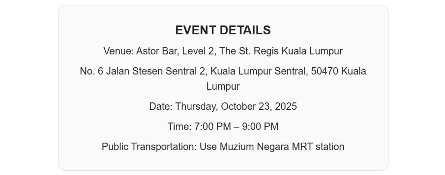 The next edition of TEG Mingle Plus promises to be a night to remember, taking place at one of Kuala Lumpur’s most refined venues — the Astor Bar at The St. Regis Kuala Lumpur. Known for its polished ambience, timeless design, and impeccable service, this five-star setting offers the perfect backdrop for an elevated evening of networking, relaxation, and indulgence.