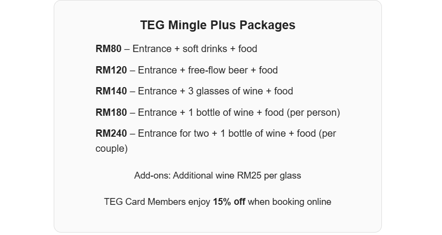 As the premium version of the popular TEG Mingle series, Mingle Plus events take things up a notch with a carefully curated selection of upgraded wines (or choose a free flow of cold beers), great lucky draw prizes — including a luxurious night’s hotel stay for a lucky winner — and an array of quality food offerings. Whether you’re catching up with friends or expanding your circle, this will be an evening defined by good taste and good company.