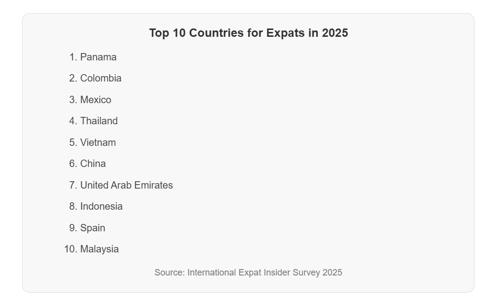 Indeed, this year’s survey saw half of the world’s top 10 expat destinations located in Asia: Thailand, Vietnam, China, Indonesia, and Malaysia. While Latin American countries still dominate the upper ranks, Asia’s mix of affordability, quality of life, and work opportunities has made it the new frontier for those seeking balance between comfort and adventure.