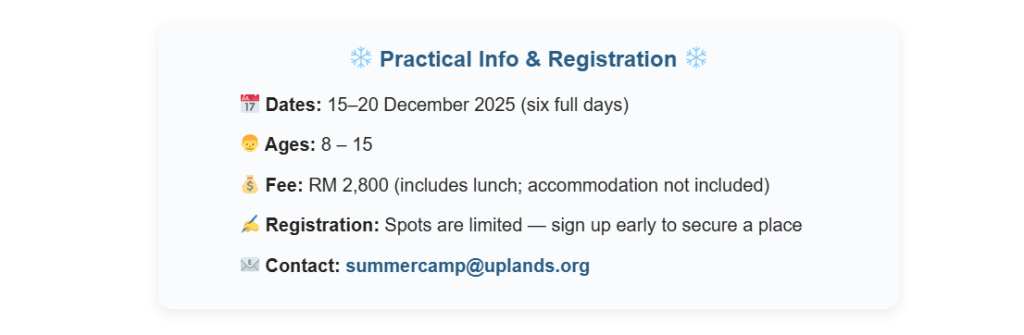 The camp connects nicely with Uplands’ larger ethos and identity. Established in 1955 and now housed on a purpose-built campus in Batu Ferringhi since 2006, Uplands blends heritage and modern education. It offers the IB Primary Years Programme, Cambridge IGCSE, and the IB Diploma Programme, and fosters a multicultural, inquiry-based learning culture. The Winter Camp becomes an extension of that vision — a short but potent opportunity for growth, curiosity and community.