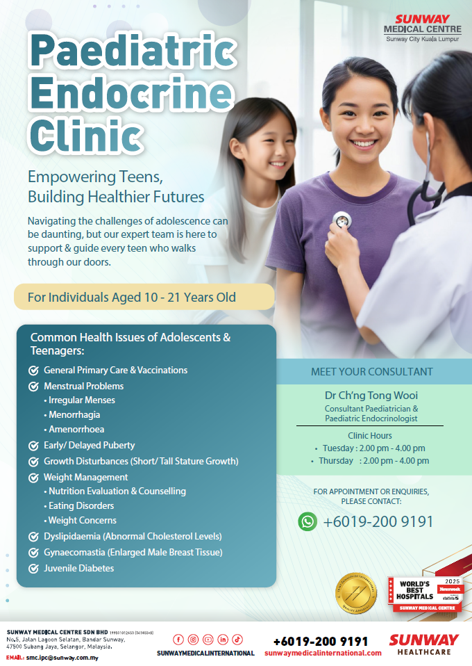 Adolescence marks one of life’s most dynamic phases — a period of transformation that brings physical, emotional, and hormonal changes in rapid succession. It’s a time filled with discovery, change, and growth For parents, especially those living abroad, it can sometimes be worrying when a child’s growth or puberty doesn’t follow the usual pattern. To provide families with expert guidance through every stage of development, Sunway Medical Centre in Sunway City offers the Paediatric Endocrine Clinic, a dedicated service for children and young people from birth to 21 years old.