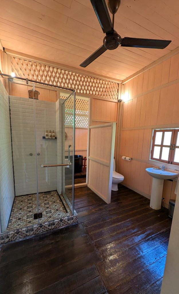 Bathrooms are typically modern, with walk‑in showers and quality fixtures, though the layout will vary from room to room. I stayed in Johor 2, an incredibly spacious two-bedroom suite located upstairs from (wait for it) Johor 1. The living room was comfy and well-appointed; the bathroom was large and even boasted a sizeable wooden bathtub in addition to the large shower. There were two nicely furnished bedrooms, an extra room with a desk and wardrobe (and a minibar stocked with complimentary drinks), and an incredibly expansive veranda overlooking the grounds and pool. A ceiling fan or two on the veranda would have been nice and likely have made it even more usable. As it was, though, it was still quite okay at most times.
