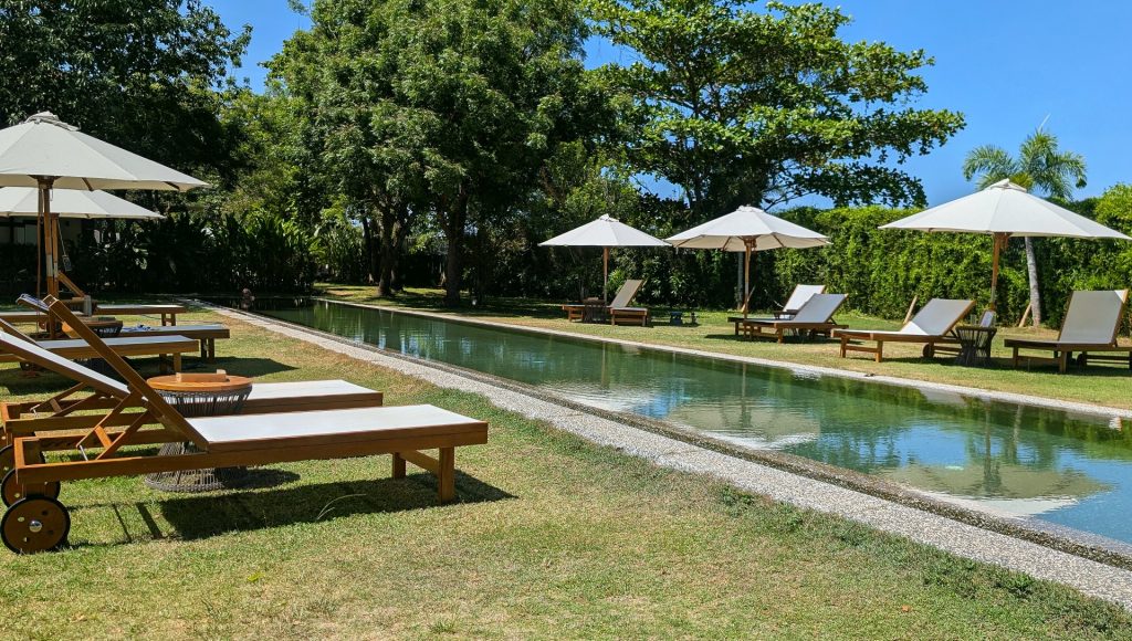 The resort’s pool area is a focal point of communal enjoyment. Surrounded by palms and flowering shrubs, it’s a favourite spot for early morning swims or quiet afternoon laps. Loungers are set under umbrellas, and the water in the long lap pool is clean and inviting. Unlike most resort pools which are designed from scratch and purpose-built as a centrepiece, it seems like the pool at Temple Tree was kind of just put into the garden. There’s no real pool deck to speak of, the loungers and umbrellas are placed along either side, and there’s a cabana at one end with cold drinks and other poolside services on offer. It sort of looks like it was an afterthought at one point in the resort’s history, but it’s done very nicely nevertheless, and was definitely a popular everyday place for the guests on hand when we visited.