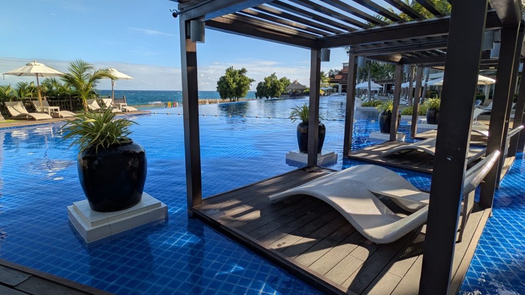 The resort’s location, about 25 minutes from Mactan-Cebu International Airport, makes it both convenient and slightly removed from the busier resort clusters, lending it a more relaxed, private feel that suits both short breaks and longer, restorative stays. The rooms are contemporary and fairly straightforward. We enjoyed the nice balcony overlooking the beautiful pool on to the sea beyond, and found everything in the room to be completely satisfactory.