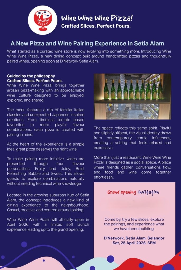 Pizza and wine? We’re already on board! A new dining concept is set to make its debut in Setia Alam, and it comes with a simple but compelling idea – great pizza deserves the right wine. Wine Wine Wine Pizza! builds on the foundation of a curated wine background, evolving into a casual, sociable space where food and wine are designed to work together from the outset.