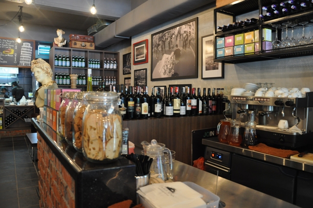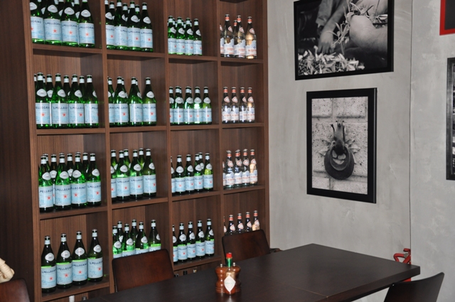 As I admired the baby blue and bright red Vespas, my eyes began to roam around the quaint little outlet, taking in the vintage black and white photographs on the wall, the imported wood tables, the rows of wine, Pellegrino bottles on the shelf, bottles containing sizzling red chillies infused with olive oil on the tables, the open pasta kitchen at the back, the fancy espresso machine behind the bar and finally, the impressive wood fire oven located right in front of the restaurant where all the delicious pizzas are baked to perfection. Any pizza lover will know that nothing can compare to baking a pizza in a wood fire oven. The oven helps retain and expand all the wonderful flavours of a pizza while cooking it in no time. Sadly, not many outlets believe in using a wood fire oven.